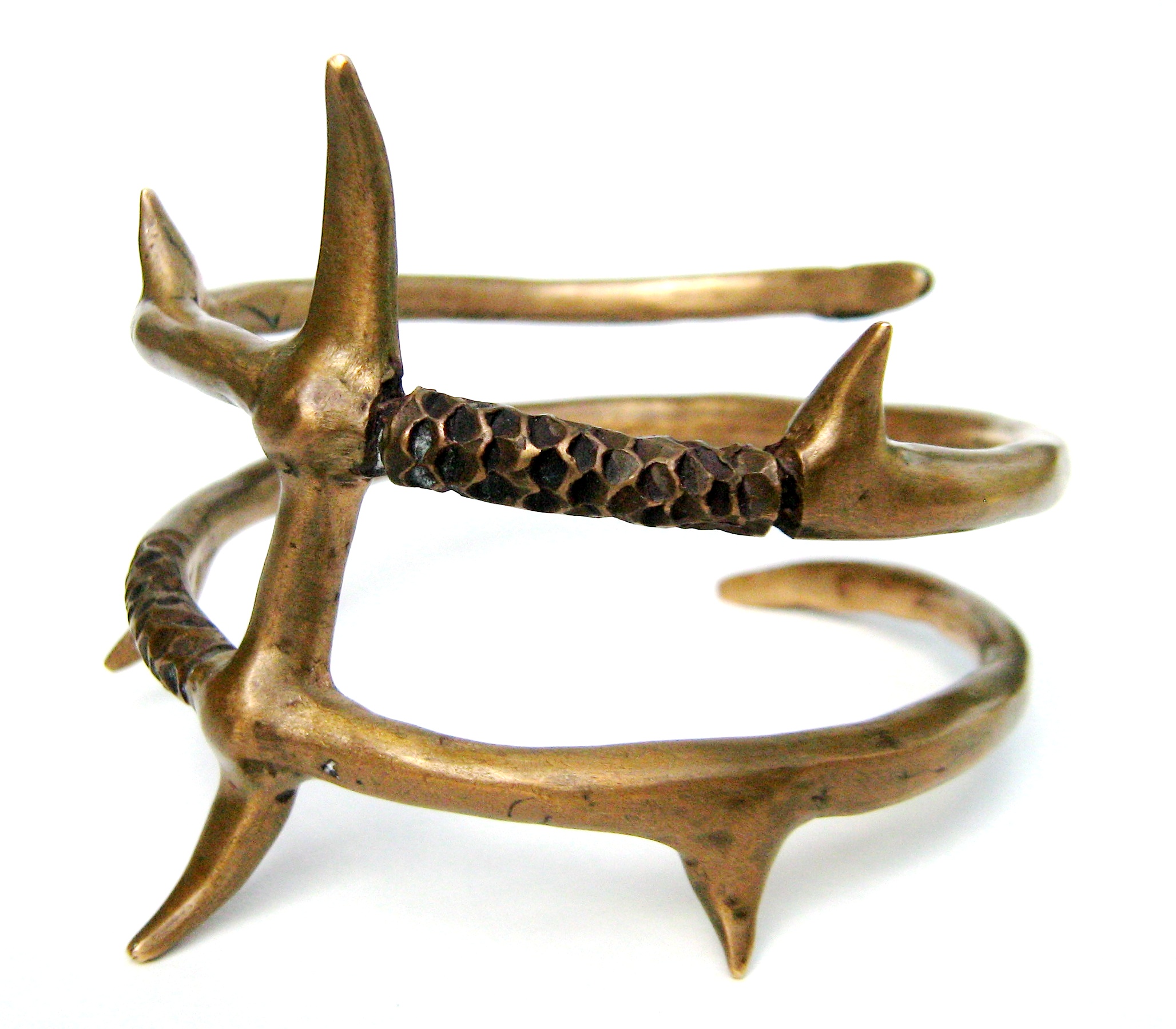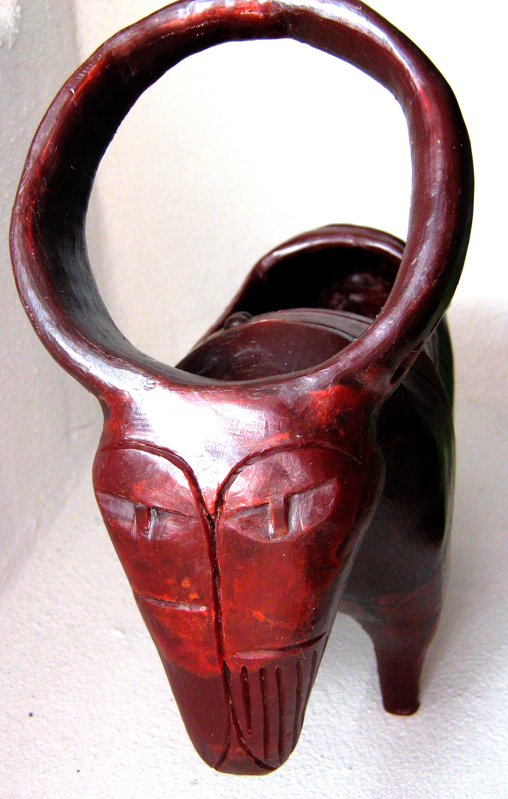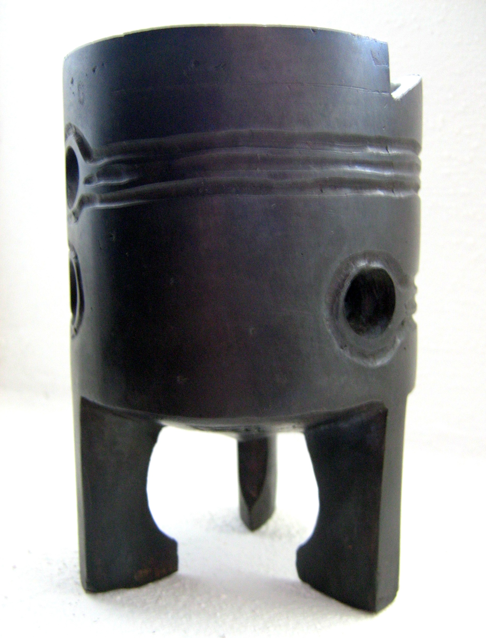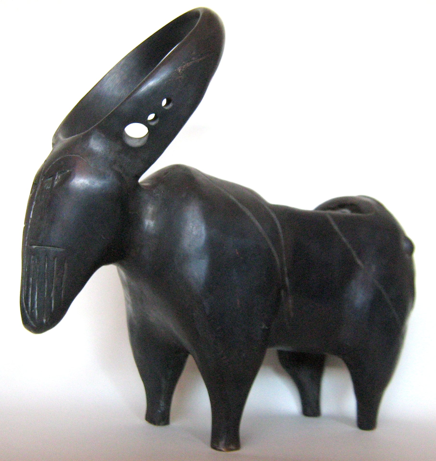 Here are some examples (Figure 11). The first one (from left to right) is a statue of a longhorn cow whose horns merge into a lunar shaped silhouette, reminiscent of ancient petroglyphs and artifacts. The body was hollowed out to be used for storing small objects. The second one is a three-legged vase used for storing objects and pens. Then, a model of asteroid Lutetia (nerdish, eh). Finally, a woman's bracelet with a stylized shape of a snake.
