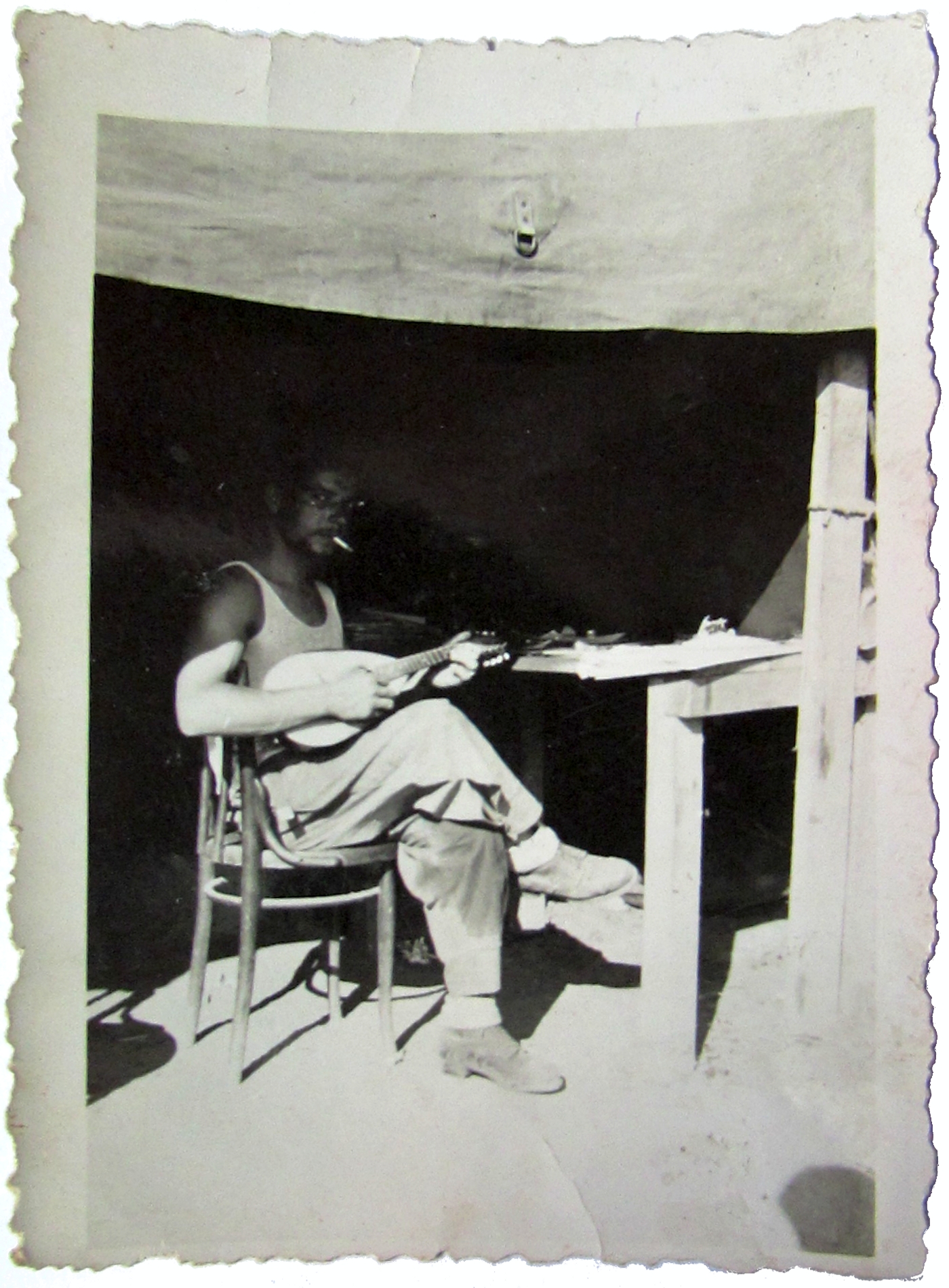 But now, back to my grandfather's picture and the guitar. The picture lacks details due to the high contrast between sun light and the interior of the camp tent, yet the shadow cast by the chair reveals that it was taken mid-morning or mid-afternoon. Moreover, that it must have been a hot summer day, as suggested by the clothing. Interestingly, even though the picture was definitely taken in a moment of leisure, there is no joy on my grandfather's face. Sometimes I wonder how the war changed him, and why he never told me about the guitar. Maybe he was a fine guitar player, who decided to stop the music in respect to his fallen comrades. Maybe he was just mimicking playing to amuse his fiancee who would have received the picture, or perhaps for a few moments of distraction from the cruel reality. I will never know.