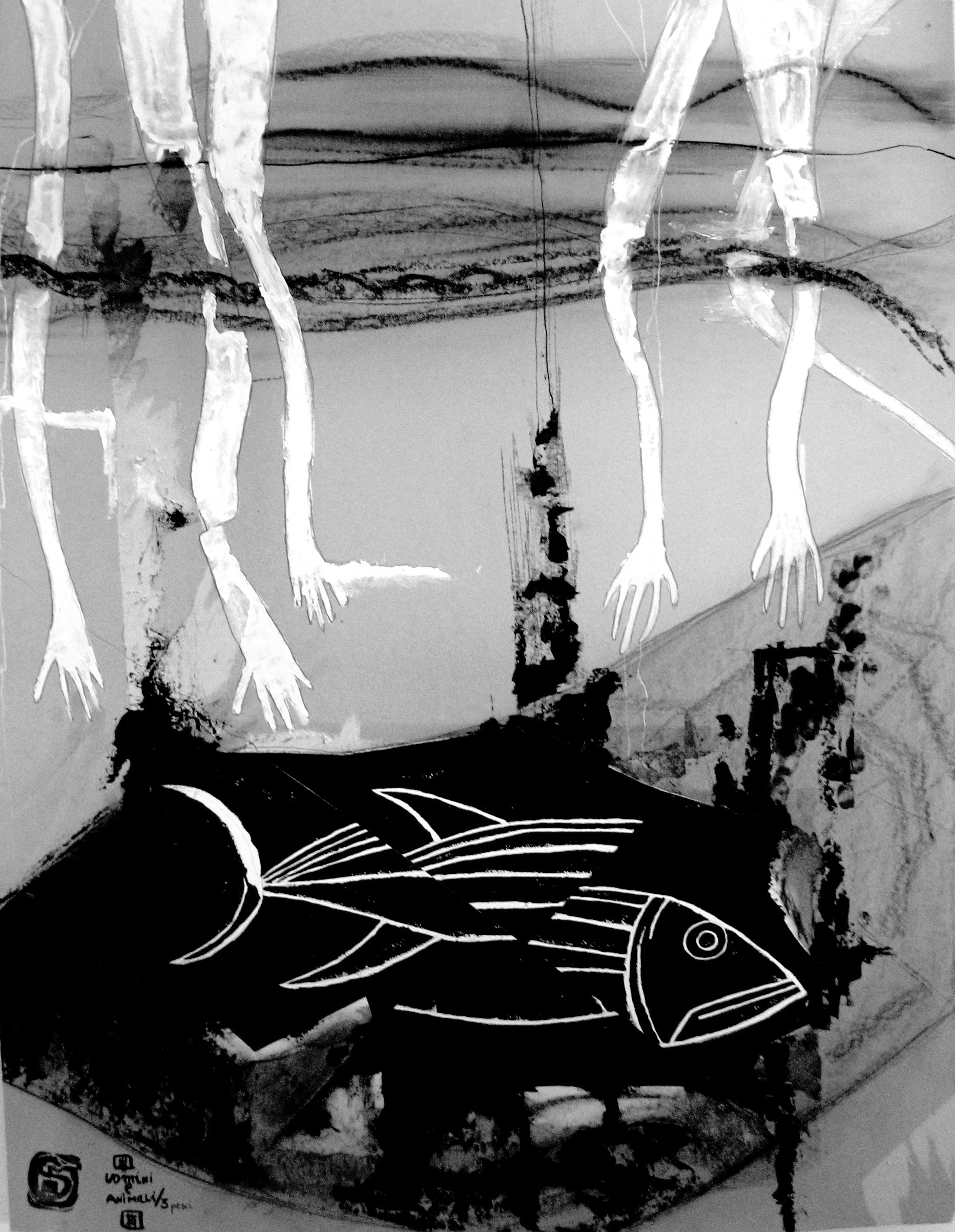 Here are a couple of examples of my paintings. The first one (Figure 10, left) dates back to about 2008 (more or less, since I never used to put a date on my works), and it belongs to a series of 5 paintings. The series is called "Uomini & Animali" (Humankind & Animals), and this one is entitled "Pesci" (Fish).