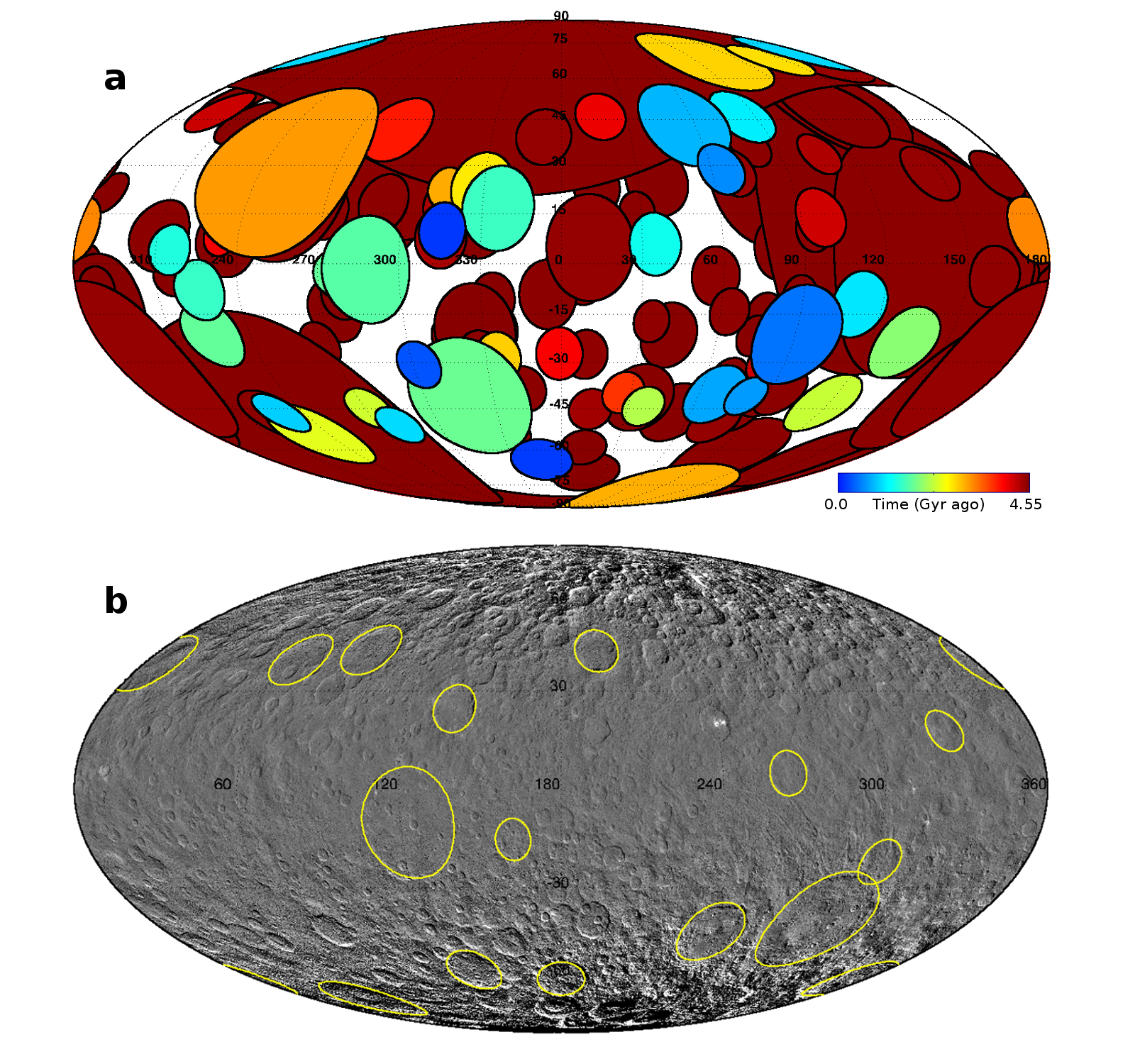Figure 1. (a) Mollweide projection of all impact craters >100 km (~170) expected to have formed since 4.55 Gyr ago. The picture shows a representative Monte Carlo simulation for the nominal model. Colour code provides epoch of formation. While old craters are obliterated by subsequent cratering, empirical saturation shows that some 40 craters >100 km should be retained. (b) Mollweide projection of a Ceres global mosaic showing observed 16 confirmed craters >100 km (yellow lines).